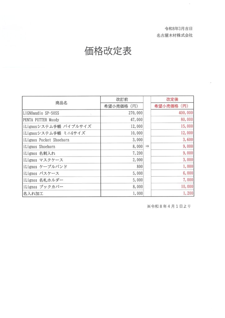 下記の通り、商品の価格を改定させていただくこととなりました。